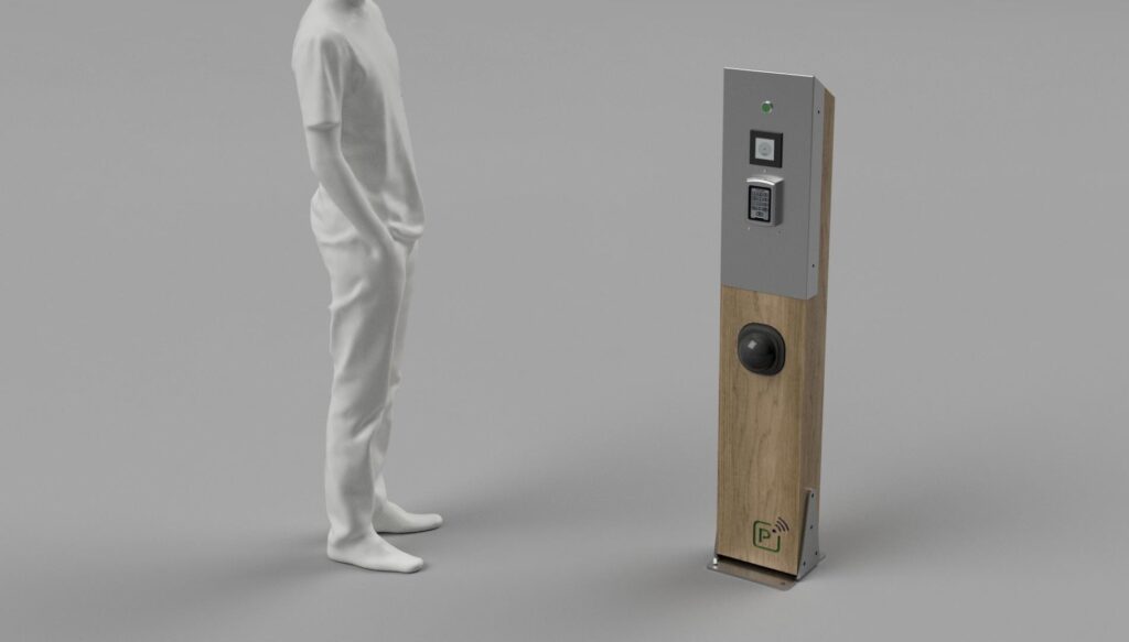Poste de madera con cabeza metálica diseñado para alojar un teclado numérico, un lector, un indicador LED y una cámara.alojar un radar de proximidad y un indicador LED.